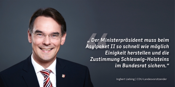 "In der Kieler Koalition und Landesregierung herrscht mal wieder ein Hin und Her über die Positionierung zum Asylpaket II und zur Ausweisung sicherer Herkunftsstaaten in Nordafrika. Der Ministerpräsident muss hier so schnell wie möglich Einigkeit herstellen und die Zustimmung Schleswig-Holsteins im Bundesrat sichern", so der CDU-Landesvorsitzende Ingbert Liebing heute in Kiel.
