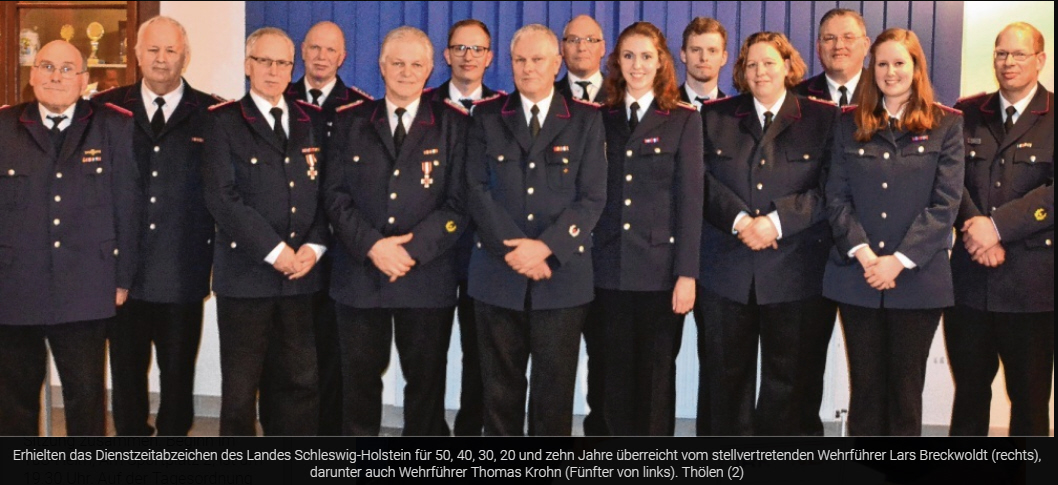 HASLOH Die Freiwillige Feuerwehr Hasloh hat während ihrer Jahreshauptversammlung 16 Kameraden für insgesamt 535 Jahre aktive Wehrzugehörigkeit geehrt. Das Dienstzeitabzeichen des Landes Schleswig-Holstein für ein halbes Jahrhundert erhielten Uwe Schwenke und Hans-Herbert Brandt, überreicht durch den stellvertretenden Wehrführer Lars Breckwoldt. Unter den Geehrten für die 40-jährige Zugehörigkeit mit aktiv geleistetem Dienst war außer Jens-Peter Hartel und Mathias Deutschmann Wehrführer Thomas Krohn.