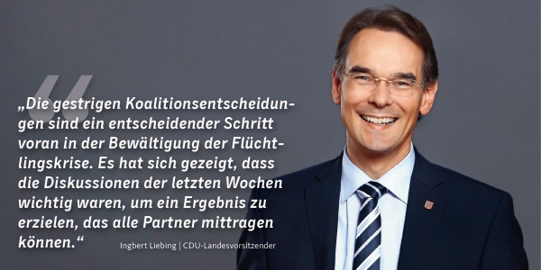 "Die gestrigen Koalitionsentscheidungen sind ein entscheidender Schritt voran in der Bewältigung der Flüchtlingskrise. Es hat sich gezeigt, dass die Diskussionen der letzten Wochen wichtig waren, um ein Ergebnis zu erzielen, das alle Partner mittragen können. Ohne diese Diskussionen hätte es kein Ergebnis gegeben, ohne den Druck von CDU und CSU hätte die SPD von sich aus keine der jetzt vereinbarten Maßnahmen auf den Weg gebracht. Herr Stegner war immer nur gegen alles. Gut, dass er nicht den Kurs für die SPD in der Berliner Koalition bestimmt", bewertet der CDU-Landesvorsitzende Ingbert Liebing den Beschluss der Parteivorsitzenden von CDU, CSU und SPD.