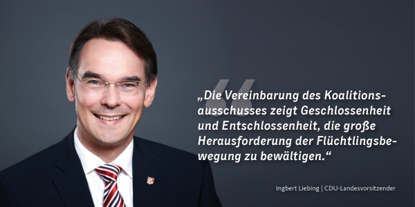 "Die Vereinbarung des Koalitionsausschusses zeigt Geschlossenheit und Entschlossenheit, die große Herausforderung der Flüchtlingsbewegung zu bewältigen", begrüßte der CDU-Landesvorsitzende die Ergebnisse der gestrigen Sitzung. Es sei ein gutes Signal, dass der Bund mit den beschlossenen Maßnahmen Länder, Kommunen und die vielen ehrenamtlich Tätigen bei der Flüchtlingshilfe unterstütze.