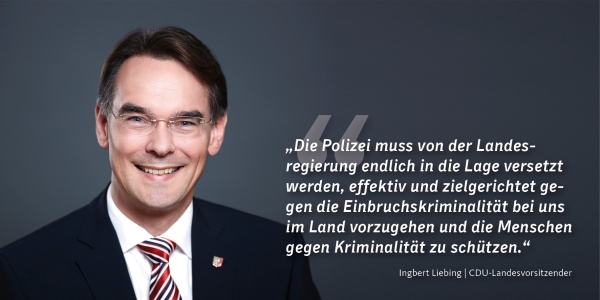 "Von einem ohnehin erschreckend hohen Niveau aus ist die Einbruchskriminalität in Schleswig-Holstein noch einmal dramatisch angestiegen. Die Polizei muss von der Landesregierung endlich in die Lage versetzt werden, effektiv und zielgerichtet gegen die Einbruchskriminalität bei uns im Land vorzugehen und die Menschen gegen Kriminalität zu schützen. Die Sicherheit der Bürgerinnen und Bürger zu gewährleisten, ist schließlich oberste Aufgabe des Staates", so Ingbert Liebing.