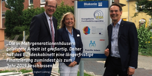 Für die dauerhafte Sicherung der Mehrgenerationenhäuser setzt sich der CDU-Landesvorsitzende Ingbert Liebing ein. Bei einem Besuch im Mehrgenerationenhaus in Husum, das er seit dem Beginn 2006 intensiv begleitet hatte, informierte sich Liebing über die aktuelle Arbeit und führte auch Gespräche mit der Landesarbeitsgemeinschaft der Mehrgenerationenhäuser.